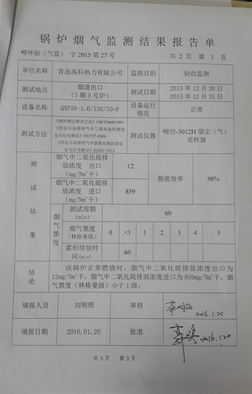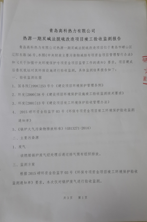 熱源一期雙堿法脫硫改造項(xiàng)目驗(yàn)收監(jiān)測(cè)報(bào)告